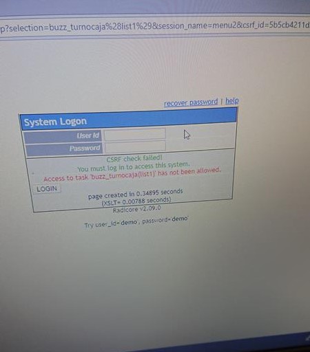 Thanks for your answer, I'd like to know under which circunstances Radicore returns to the login screen with the "CSRF check failed" message? could you please help me with this issue?