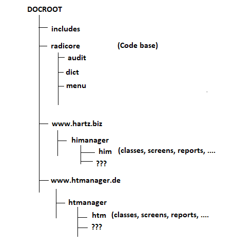 In all my installations I have the Radicore subsystem directories and all application subsystem directories under the same root folder, which may be called 'radicore' but can be anything you choose. If several domains are sharing the same code then each domain must have its DOCROOT set to the root folder mentioned above. This means that each domain will share the same files, including the config.inc file. This means that by default each domain will also share the same databases. You can alter this by setting different values in the config.inc file according to the current domain name, which is provided in $_SERVER['SERVER_NAME']. You can then use a different value for $dbprefix, such as 'htm_' and 'him_' so that the data for one domain is NOT shared with any other domain.