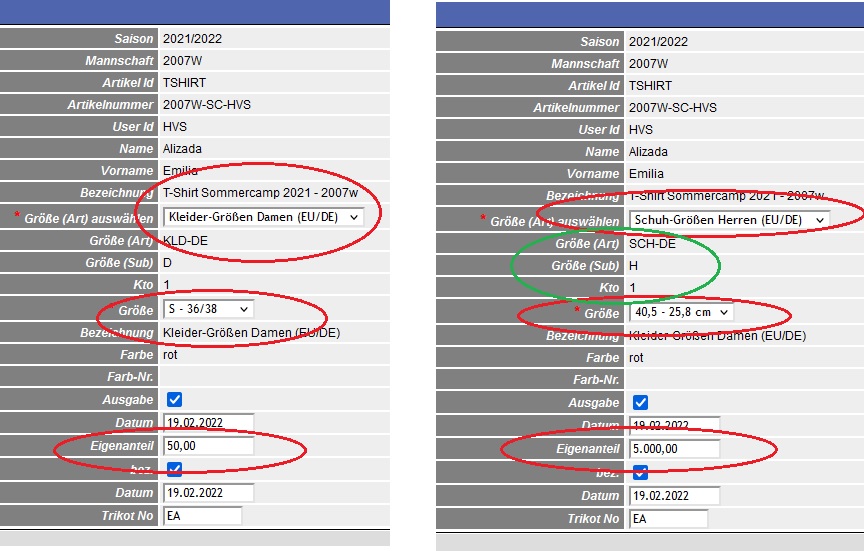 In the screenshot you see in 'Größe (Art) auswählen' the category of the size (shoes, cloth, etc.). And in 'Größe' the selectable values. In 'Eigenanteil' you see the value of the money (50.00, 5000,00).
